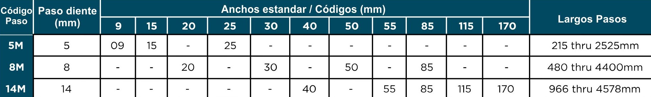 NOTA: Los anchos arriba mencionados son considerados estándar, pero las bandas HTB se pueden cortar a cualquier ancho deseado. Para construcciones en doble dentado, solo se antepone el prefijo «D» al código para su identificación.